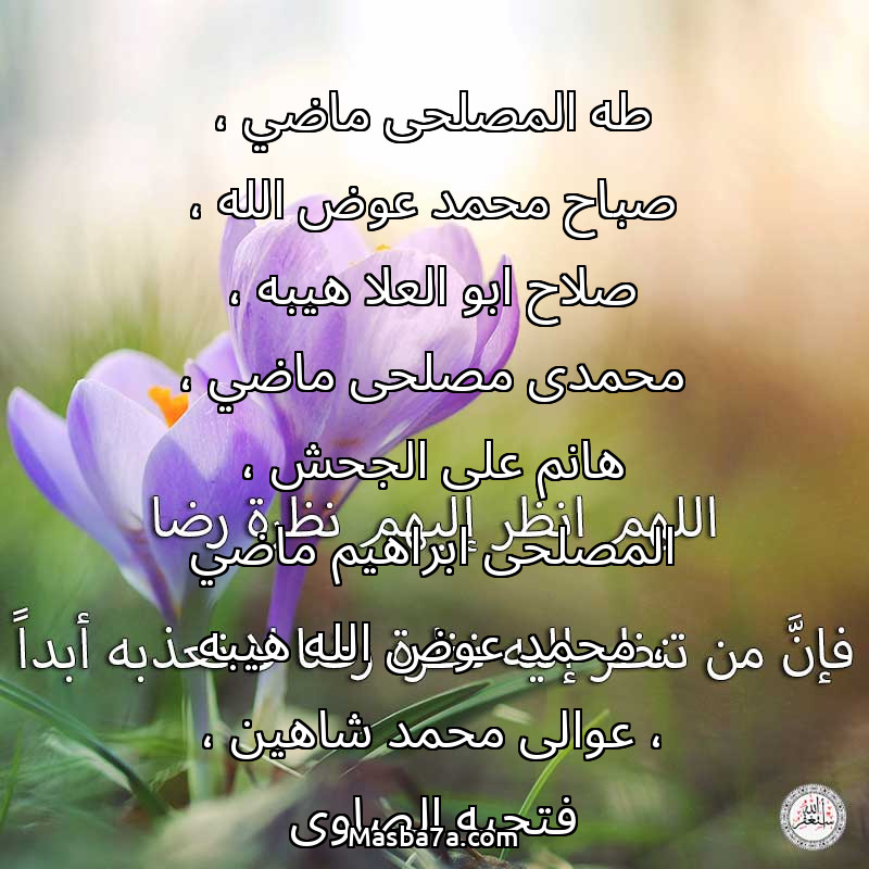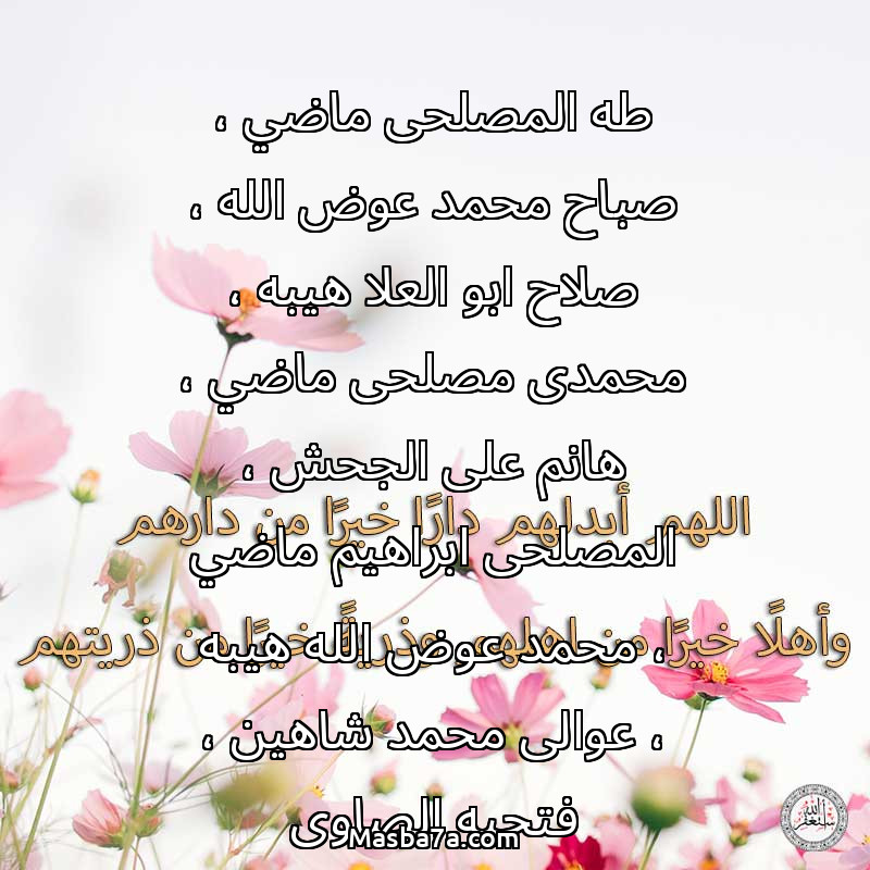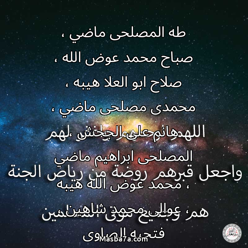 اللهم ارحم ( طه المصلحى ماضي ، صباح محمد عوض الله ، صلاح ابو العلا هيبه ، محمدى مصلحى ماضي ، هانم على الجحش ، المصلحى ابراهيم ماضي ، محمد عوض الله هيبه ، عوالى محمد شاهين ، فتحيه الصاوى الحفناوى، القطب محمد شاهين ، عبد المؤمن محمد الوحش وكل من له حق علينا وامواتنا واموات المسلمين ) وانس وحشتهم واجمعنا بهم في جنتك ، اللهم ارحمهم بقدر شوقنا لهم اللهم ارحمهم واغفر لهم.