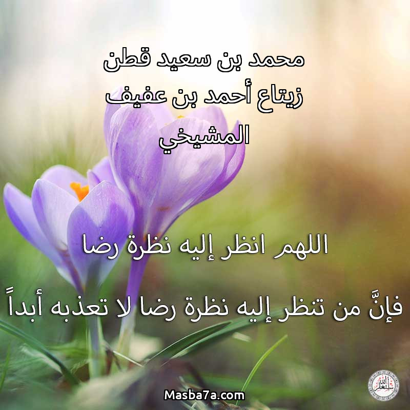 اللهم ارحم ( محمد بن سعيد قطن زيتاع أحمد بن عفيف المشيخي ) وانس وحشته واجمعنا به في جنتك ، اللهم ارحمه بقدر شوقنا له اللهم ارحمه واغفر له .