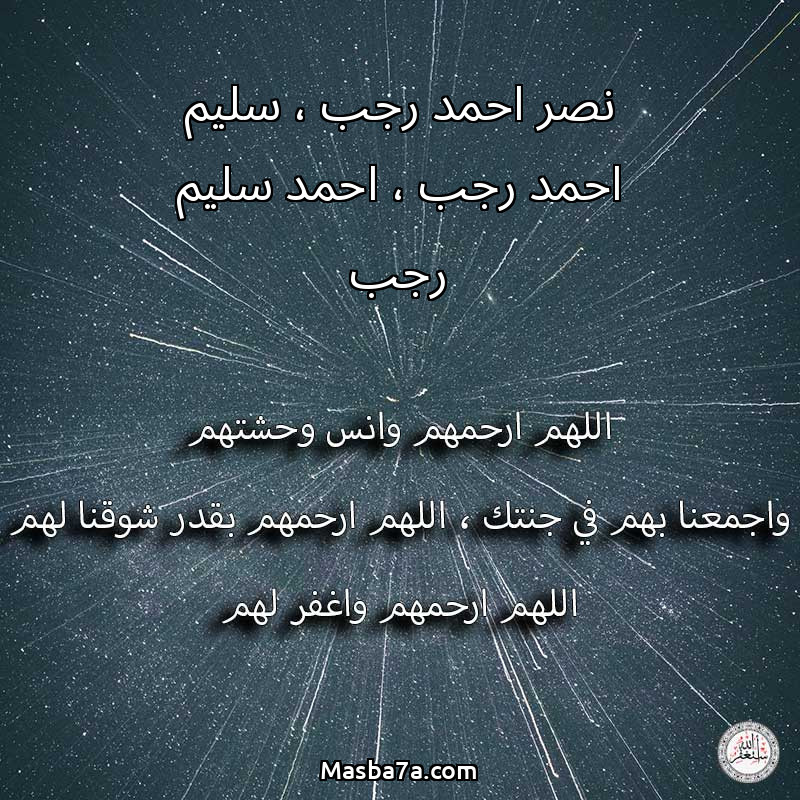 اللهم ارحم ( نصر احمد رجب ، سليم احمد رجب ، احمد سليم رجب ) وانس وحشتهم واجمعنا بهم في جنتك ، اللهم ارحمهم بقدر شوقنا لهم اللهم ارحمهم واغفر لهم.