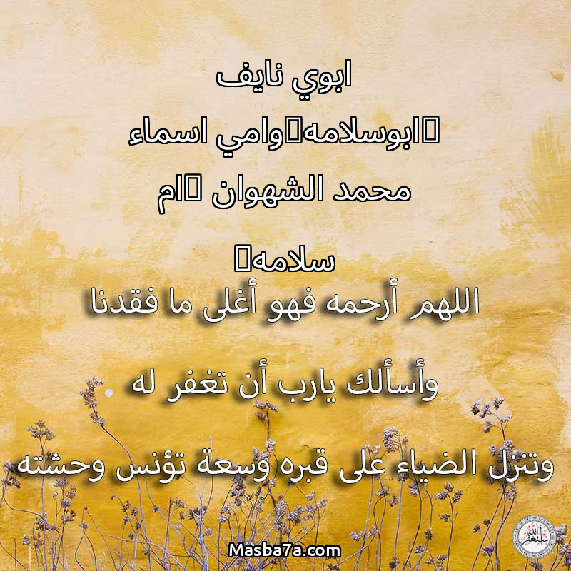 اللهم ارحم ( ابوي نايف (ابوسلامه)وامي اسماء محمد الشهوان (ام سلامه) ) وانس وحشته واجمعنا به في جنتك ، اللهم ارحمه بقدر شوقنا له اللهم ارحمه واغفر له .