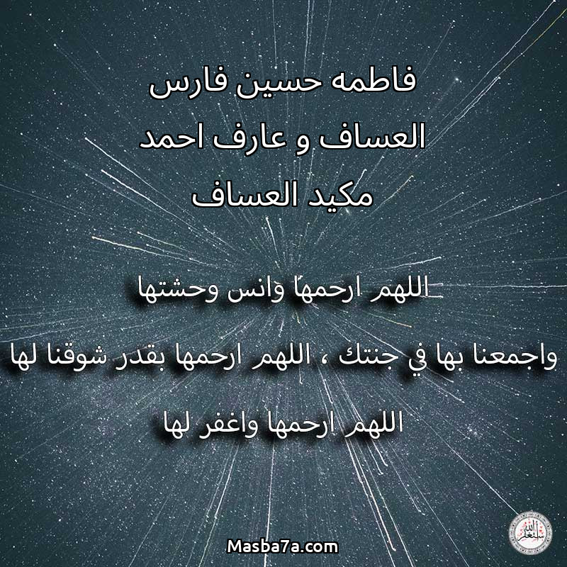 اللهم ارحم ( فاطمه حسين فارس العساف و عارف احمد مكيد العساف ) وانس وحشتها واجمعنا بها في جنتك ، اللهم ارحمها بقدر شوقنا لها اللهم ارحمها واغفر لها .