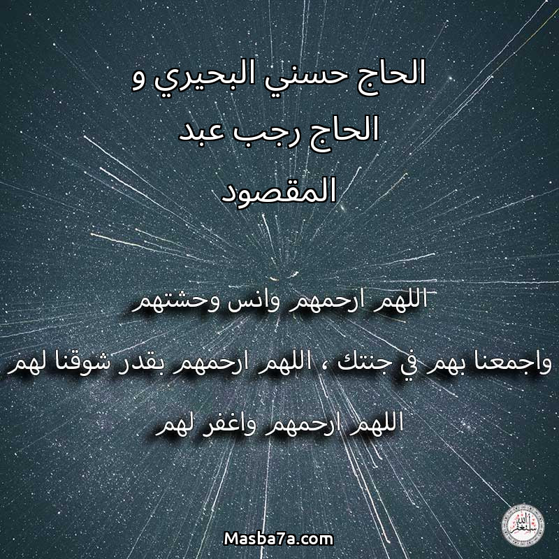 اللهم ارحم ( الحاج حسني البحيري و الحاج رجب عبد المقصود ) وانس وحشتهم واجمعنا بهم في جنتك ، اللهم ارحمهم بقدر شوقنا لهم اللهم ارحمهم واغفر لهم.