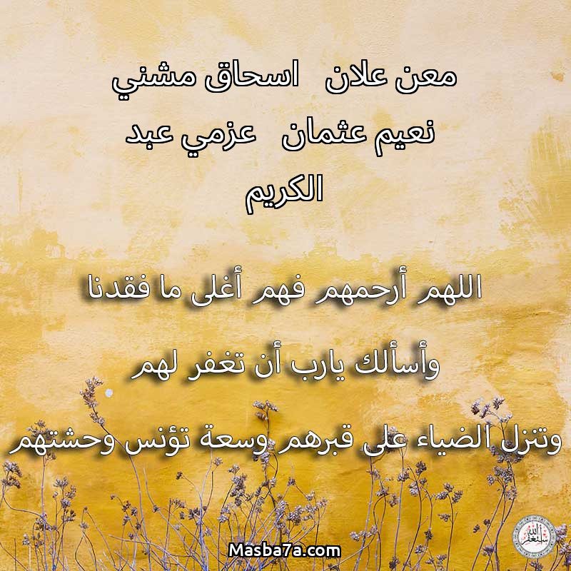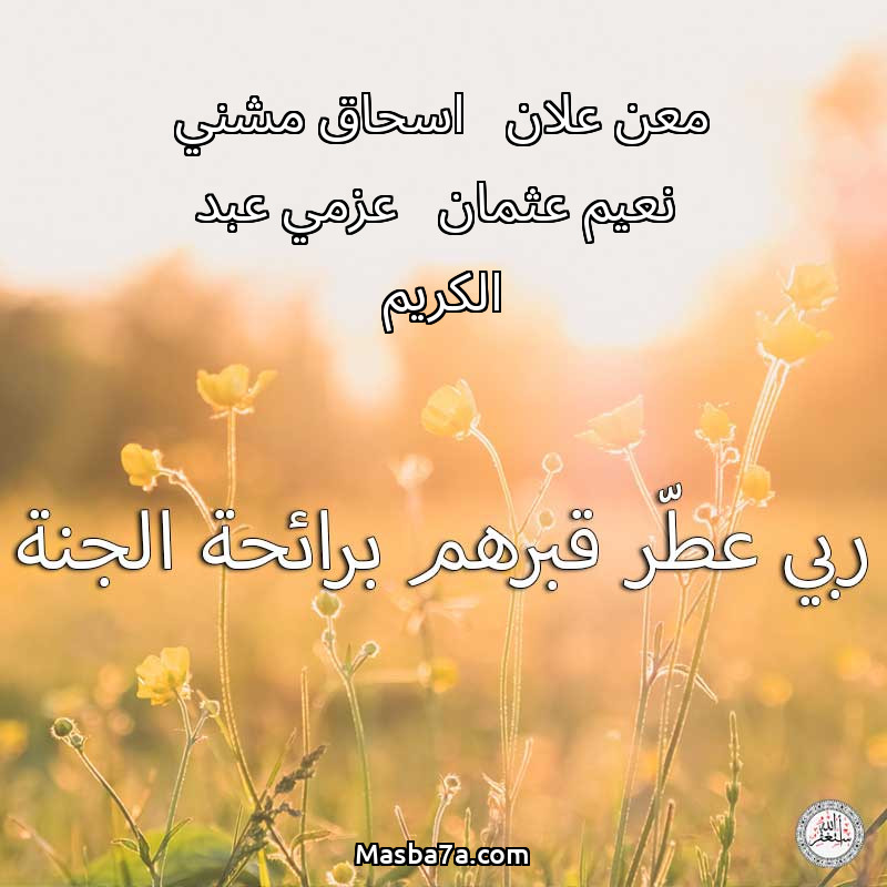 اللهم ارحم ( معن علان - اسحاق مشني - نعيم عثمان - عزمي عبد الكريم ) وانس وحشتهم واجمعنا بهم في جنتك ، اللهم ارحمهم بقدر شوقنا لهم اللهم ارحمهم واغفر لهم.