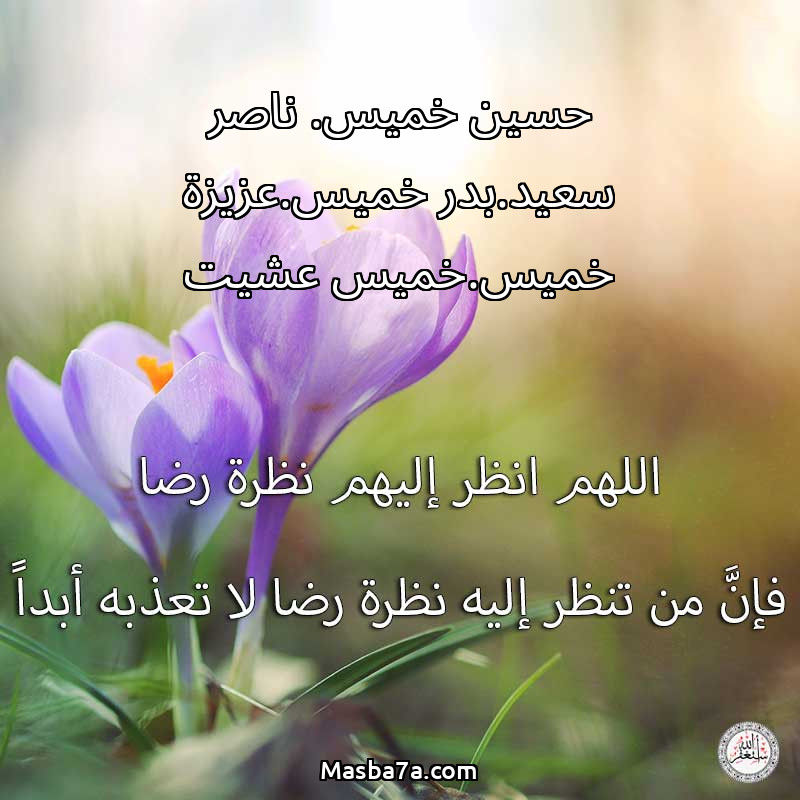اللهم ارحم ( حسين خميس. ناصر سعيد.بدر خميس.عزيزة خميس.خميس عشيت ) وانس وحشتهم واجمعنا بهم في جنتك ، اللهم ارحمهم بقدر شوقنا لهم اللهم ارحمهم واغفر لهم.