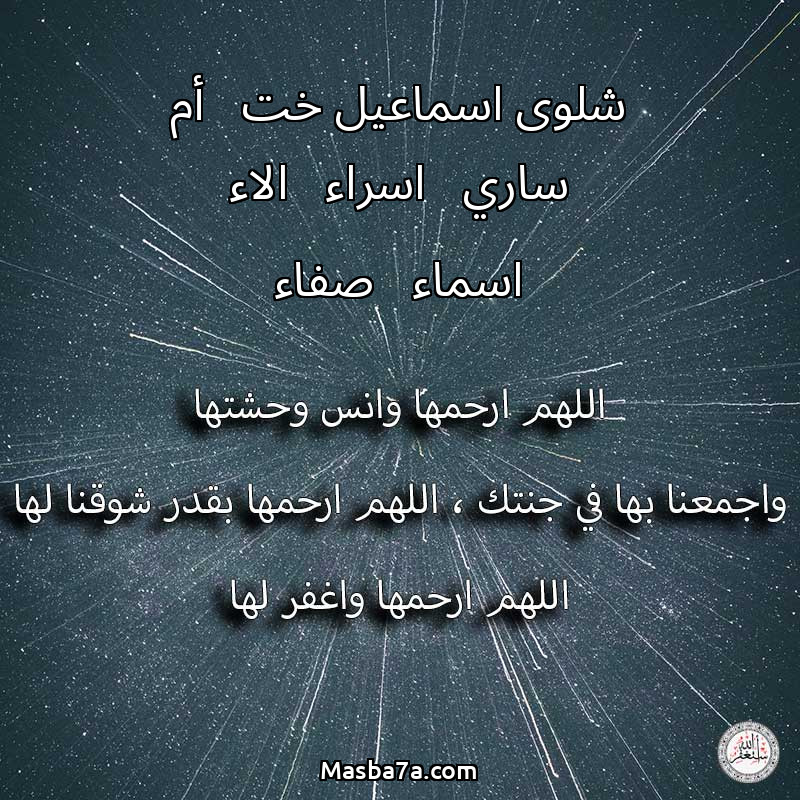 اللهم ارحم ( شلوى اسماعيل خت - أم ساري - اسراء - الاء - اسماء - صفاء ) وانس وحشتها واجمعنا بها في جنتك ، اللهم ارحمها بقدر شوقنا لها اللهم ارحمها واغفر لها .