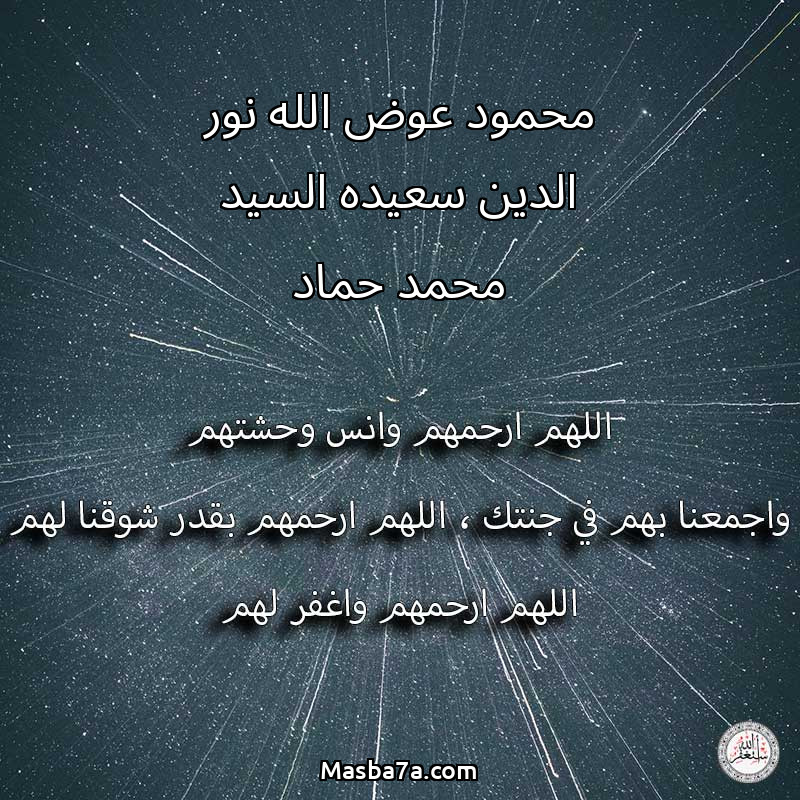 اللهم ارحم ( محمود عوض الله نور الدين سعيده السيد محمد حماد ) وانس وحشتهم واجمعنا بهم في جنتك ، اللهم ارحمهم بقدر شوقنا لهم اللهم ارحمهم واغفر لهم.