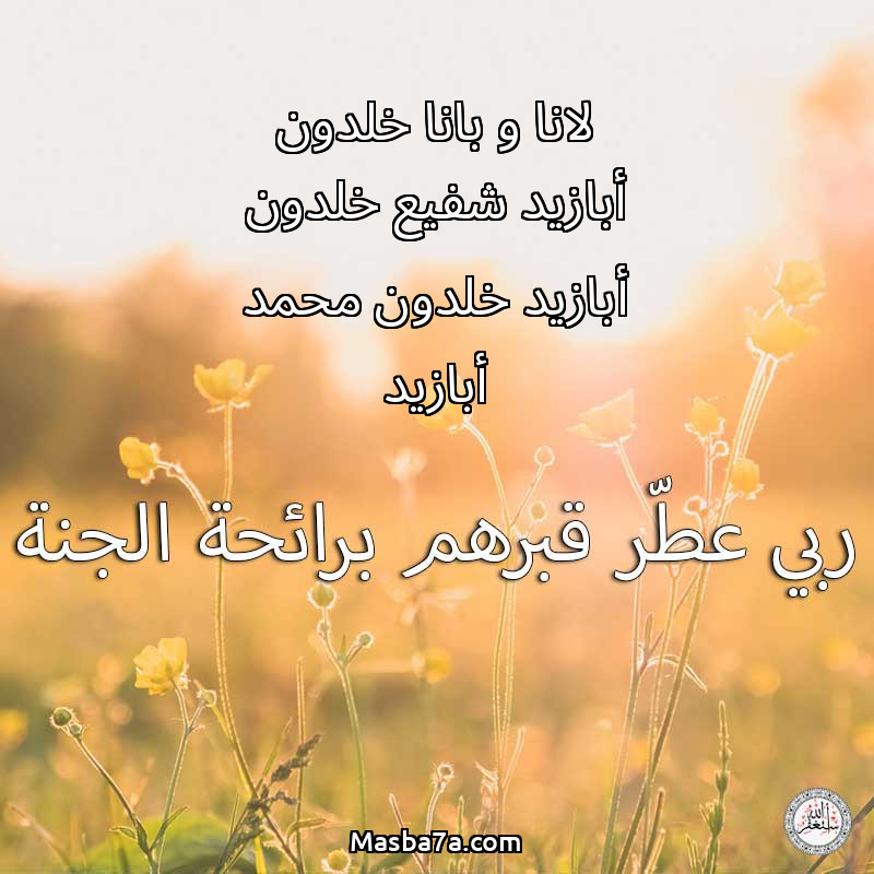 اللهم ارحم ( لانا و بانا خلدون أبازيد شفيع خلدون أبازيد خلدون محمد أبازيد ) وانس وحشتهم واجمعنا بهم في جنتك ، اللهم ارحمهم بقدر شوقنا لهم اللهم ارحمهم واغفر لهم.