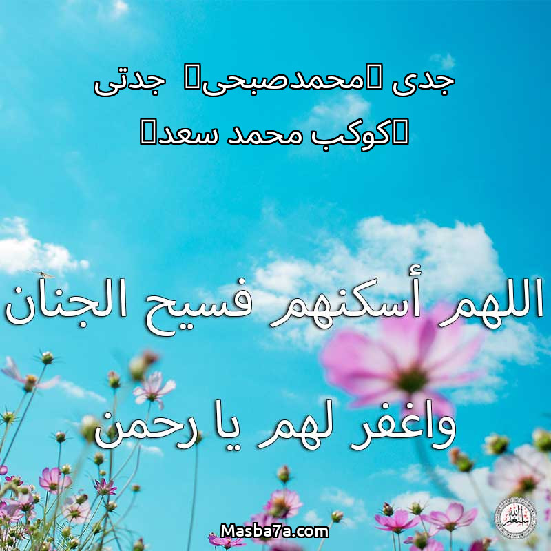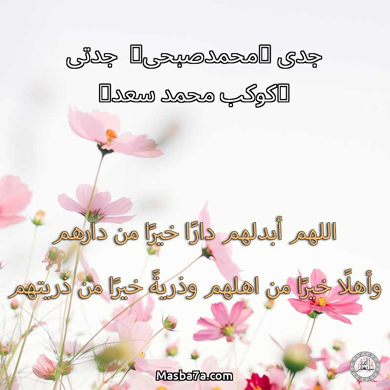 اللهم ارحم ( جدى (محمدصبحى) جدتى (كوكب محمد سعد) ) وانس وحشتهم واجمعنا بهم في جنتك ، اللهم ارحمهم بقدر شوقنا لهم اللهم ارحمهم واغفر لهم.