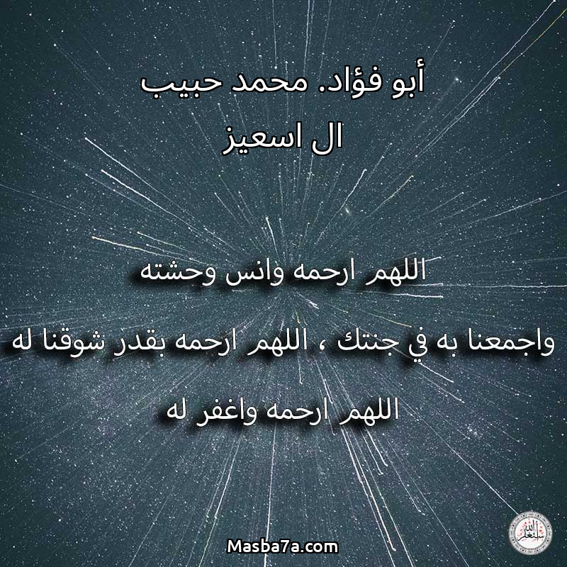 اللهم ارحم ( أبو فؤاد. محمد حبيب ال اسعيز ) وانس وحشته واجمعنا به في جنتك ، اللهم ارحمه بقدر شوقنا له اللهم ارحمه واغفر له .