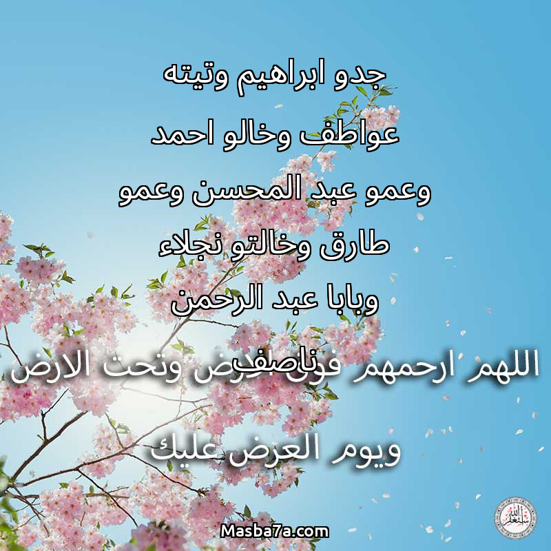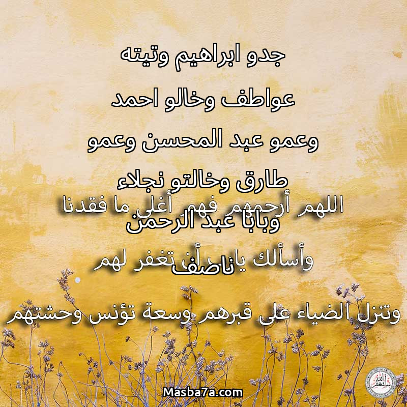 دعاء عن أرواح المرحومين جدو ابراهيم وتيته عواطف وخالو احمد وعمو عبد المحسن وعمو طارق وخالتو نجلاء وبابا عبد الرحمن ناصف