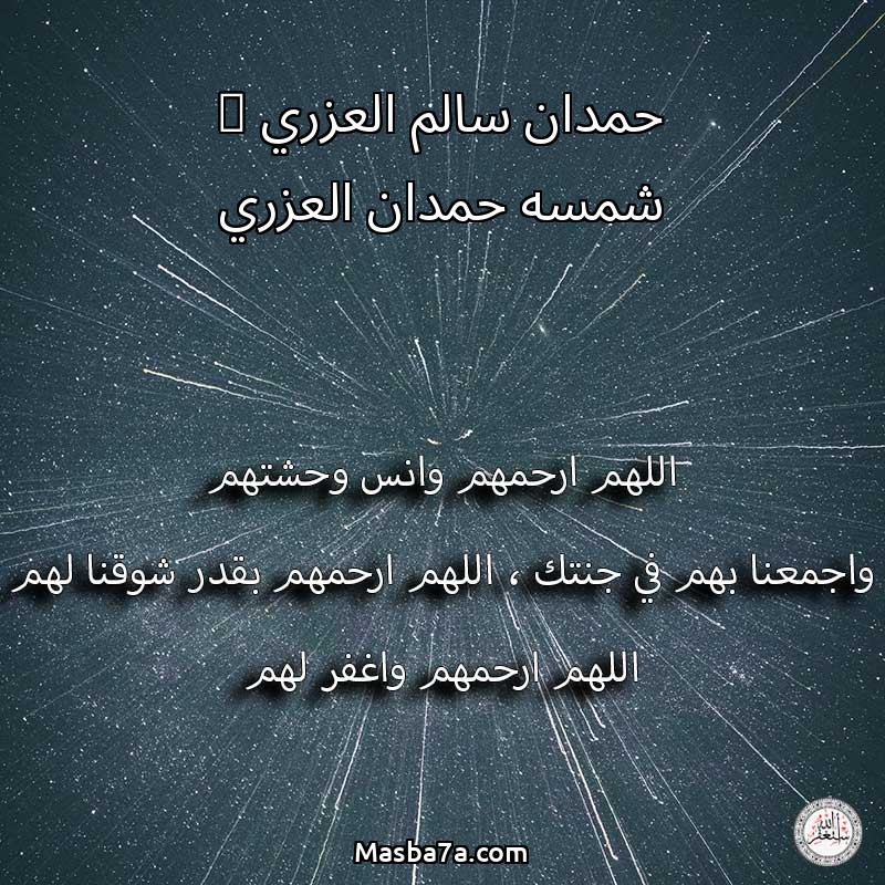 اللهم ارحم ( حمدان سالم العزري + شمسه حمدان العزري ) وانس وحشتهم واجمعنا بهم في جنتك ، اللهم ارحمهم بقدر شوقنا لهم اللهم ارحمهم واغفر لهم.