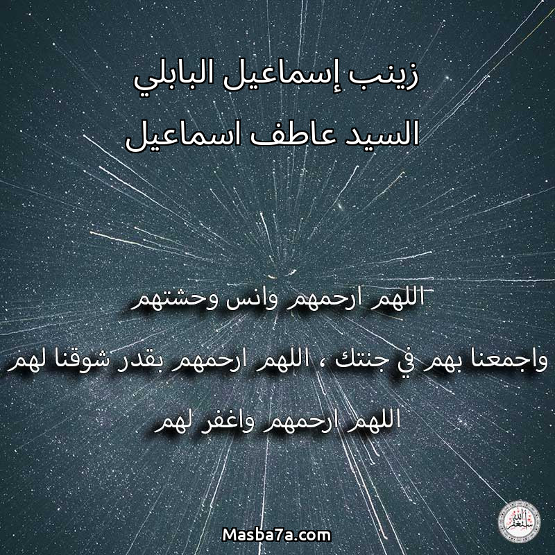 اللهم ارحم ( زينب إسماعيل البابلي السيد عاطف اسماعيل ) وانس وحشتهم واجمعنا بهم في جنتك ، اللهم ارحمهم بقدر شوقنا لهم اللهم ارحمهم واغفر لهم.