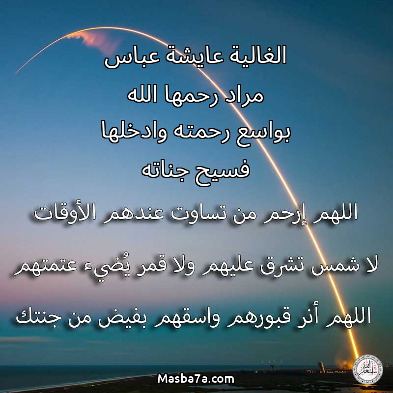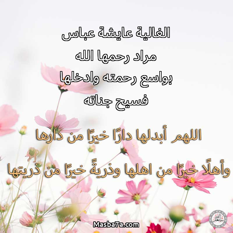 اللهم ارحم ( الغالية عايشة عباس مراد رحمها الله بواسع رحمته وادخلها فسيح جناته ) وانس وحشتها واجمعنا بها في جنتك ، اللهم ارحمها بقدر شوقنا لها اللهم ارحمها واغفر لها .