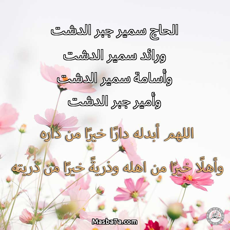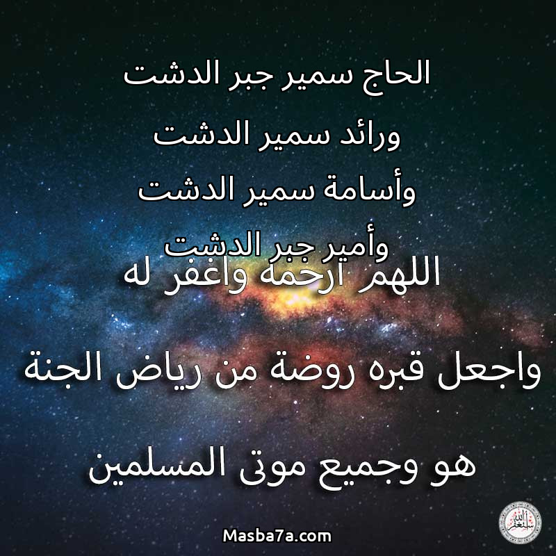 اللهم ارحم ( الحاج سمير جبر الدشت ورائد سمير الدشت وأسامة سمير الدشت وأمير جبر الدشت ) وانس وحشته واجمعنا به في جنتك ، اللهم ارحمه بقدر شوقنا له اللهم ارحمه واغفر له .