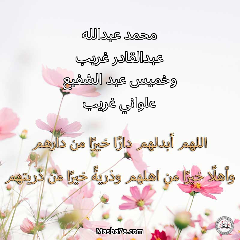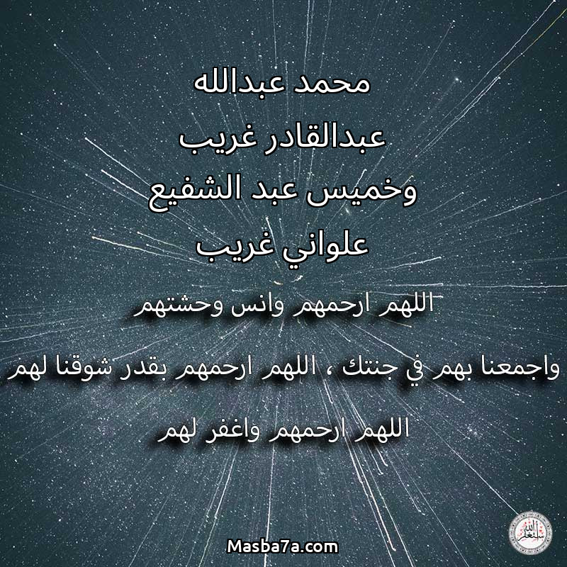اللهم ارحم ( محمد عبدالله عبدالقادر غريب وخميس عبد الشفيع علواني غريب ) وانس وحشتهم واجمعنا بهم في جنتك ، اللهم ارحمهم بقدر شوقنا لهم اللهم ارحمهم واغفر لهم.