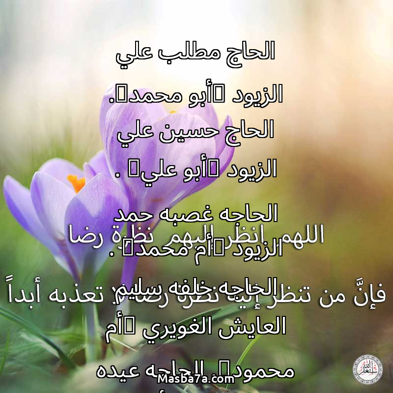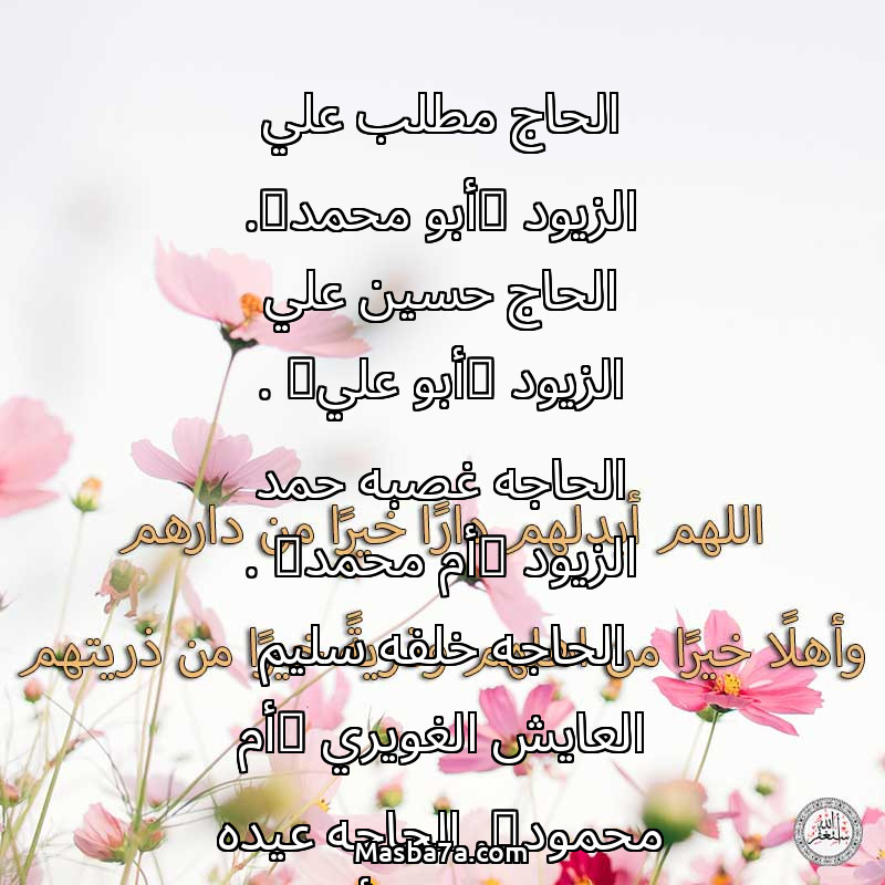 اللهم ارحم ( الحاج مطلب علي الزيود "أبو محمد". الحاج حسين علي الزيود "أبو علي" . الحاجه غصبه حمد الزيود "أم محمد" . الحاجه خلفه سليم العايش الغويري "أم محمود". الحاجه عيده عواد العباس "أم علي" ) وانس وحشتهم واجمعنا بهم في جنتك ، اللهم ارحمهم بقدر شوقنا لهم اللهم ارحمهم واغفر لهم.