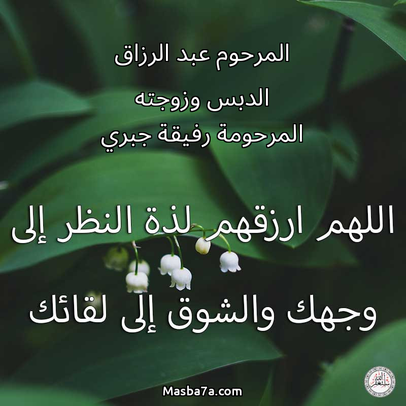 اللهم ارحم ( المرحوم عبد الرزاق الدبس وزوجته المرحومة رفيقة جبري ) وانس وحشتهم واجمعنا بهم في جنتك ، اللهم ارحمهم بقدر شوقنا لهم اللهم ارحمهم واغفر لهم.