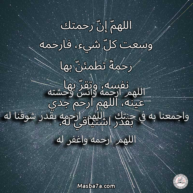 اللهم ارحم ( اللهمّ إنّ رحمتك وسعت كلّ شيء، فارحمه رحمةً تطمئنّ بها نفسه، وتقرّ بها عينه، اللهم ارحم جدي بقدر اشتياقي له. ) وانس وحشته واجمعنا به في جنتك ، اللهم ارحمه بقدر شوقنا له اللهم ارحمه واغفر له .