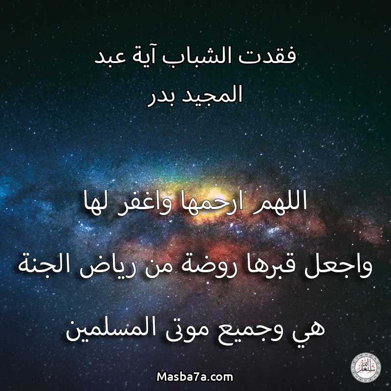 اللهم ارحم ( فقدت الشباب آية عبد المجيد بدر ) وانس وحشتها واجمعنا بها في جنتك ، اللهم ارحمها بقدر شوقنا لها اللهم ارحمها واغفر لها .