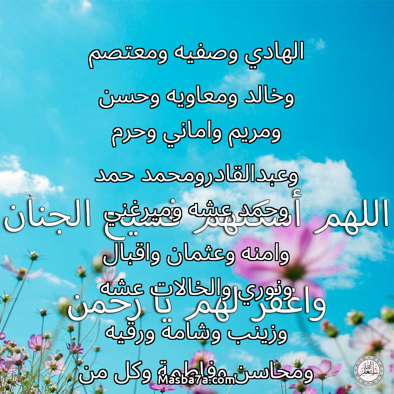 دعاء عن أرواح المرحومين الهادي وصفيه ومعتصم وخالد ومعاويه وحسن ومريم واماني وحرم وعبدالقادرومحمد حمد وحمد عشه وميرغني وامنه وعثمان واقبال ونوري والخالات عشه وزينب وشامه ورقيه ومحاسن وفاطمة وكل من سقط اسمه سهوا