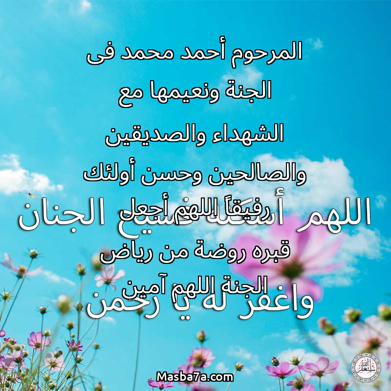 دعاء عن روح المرحوم المرحوم أحمد محمد فى الجنة ونعيمها مع الشهداء والصديقين والصالحين وحسن أولئك رفيقاً اللهم أجعل قبره روضة من رياض الجنة اللهم آمين