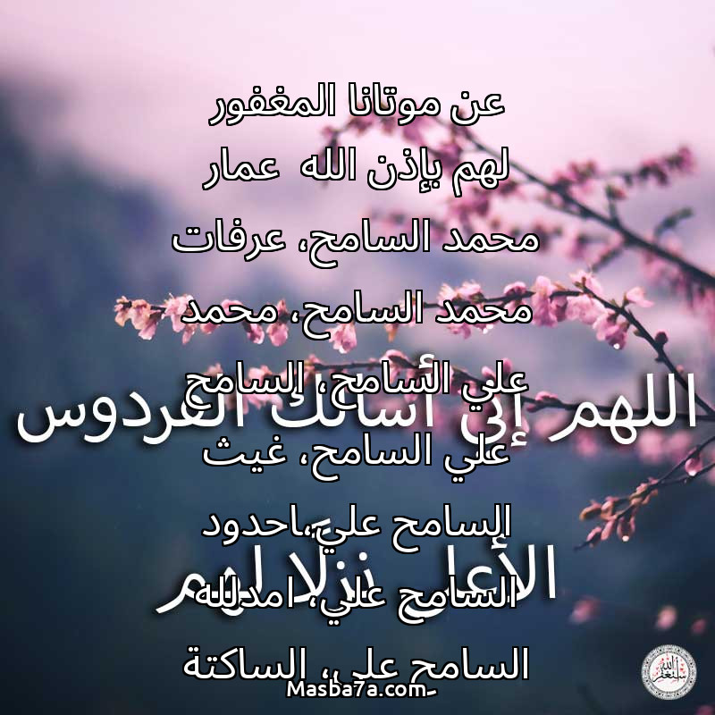 دعاء عن أرواح المرحومين عن موتانا المغفور لهم بإذن الله عمار محمد السامح، عرفات محمد السامح، محمد علي السامح، السامح علي السامح، غيث السامح علي،احدود السامح علي، امدلله السامح علي، الساكتة السامح علي