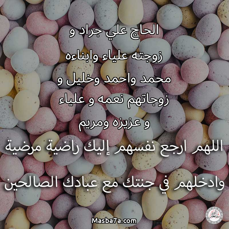 دعاء عن أرواح المرحومين الحاج علي جراد و زوجته علياء وابناءه محمد واحمد وخليل و زوجاتهم نعمه و علياء و عزيزه ومريم