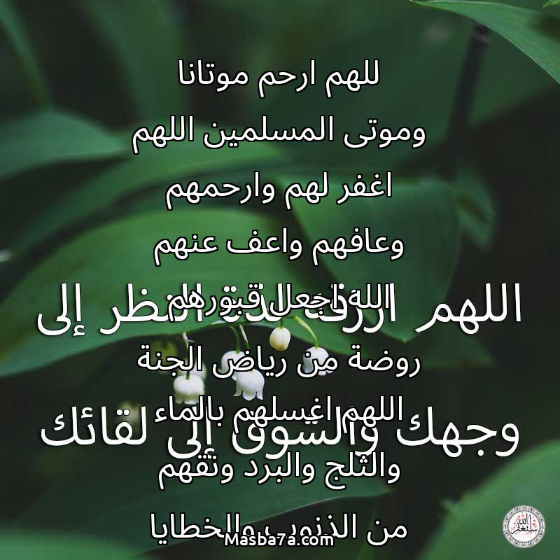 للهم ارحم موتانا وموتى المسلمين اللهم اغفر لهم وارحمهم وعافهم واعف عنهم الله اجعل قبورهم روضة من رياض الجنة اللهم اغسلهم بالماء والثلج والبرد ونقهم من الذنوب والخطايا كما ينقى الثوب الابيض من الدنس