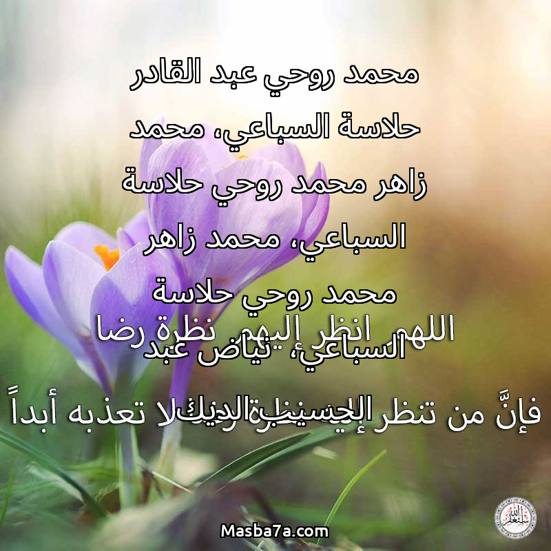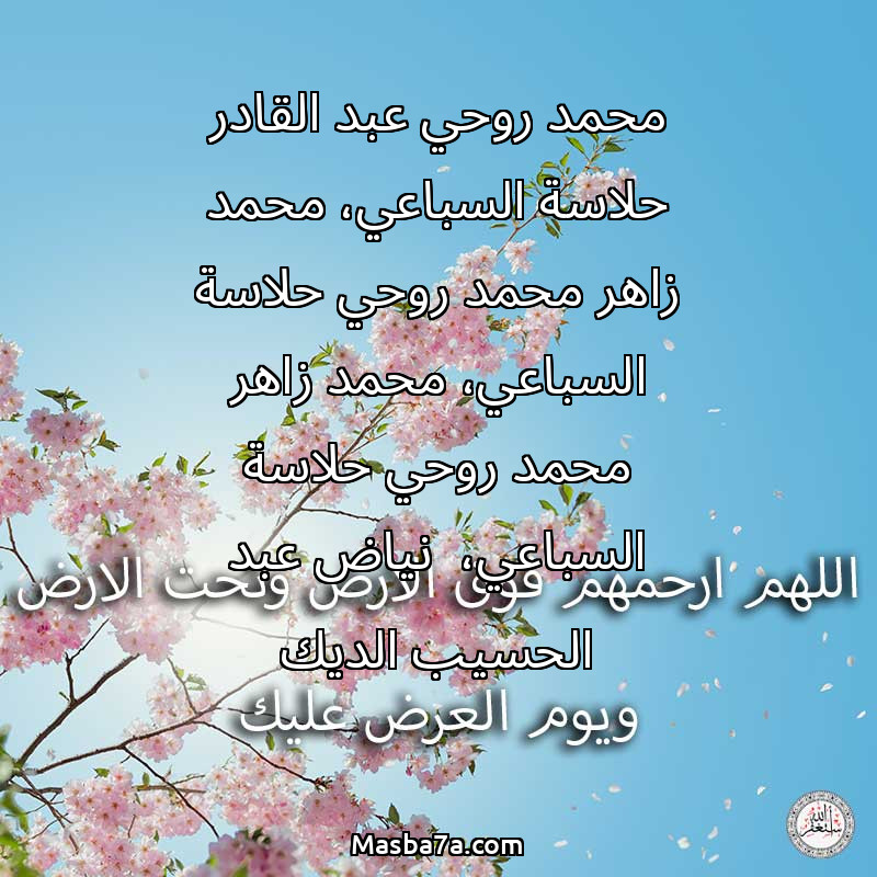 دعاء عن أرواح المرحومين محمد روحي عبد القادر حلاسة السباعي، محمد زاهر محمد روحي حلاسة السباعي، محمد زاهر محمد روحي حلاسة السباعي، نياض عبد الحسيب الديك